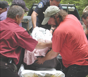With Lt. Randy Gagne and rescuer Ann Billat at his side, Gagne rendezvoused with the ambulance after a ride in the game warden's truck.