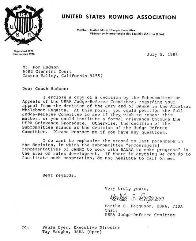 1. The Committee has received the following documents, which are incorporated into the record. Letter of Tay Vaughan to BAWRA Board of Directors dated May 15, 1988; Letter of Tay Vaughan to Pat Ferguson dated May 16, 1988; Letter of JAMMZ to BAWRA dated May 17, 1988; Letter of Tay Vaughan to BAWRA Board of Directors dated June 2, 1988; Letter of Ron Hudson (JAMMZ) to Pat Ferguson dated June 15, 1988. The Committee also notes the Rules of the Bay Area Whaleboat Rowing Association (March 23, 1987 ed.).