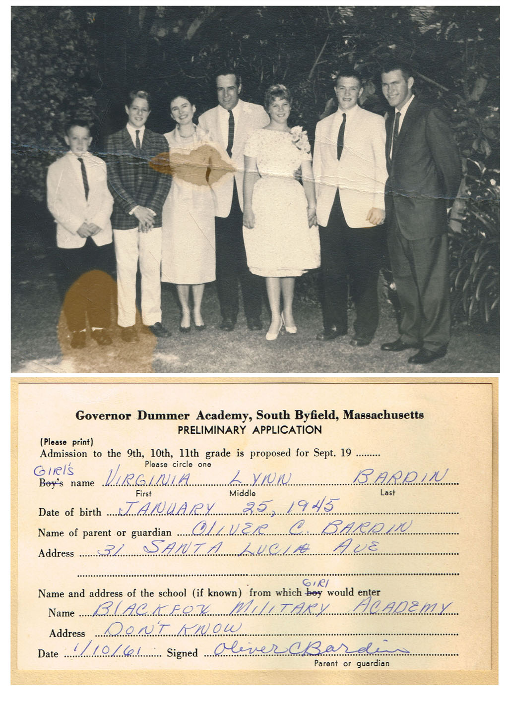 New cousin Ginger Bardin at Dad's wedding to Clarice in the summer of 1960 in Salinas, California, completes preliminary application to GDA so she can go to school with Tay...