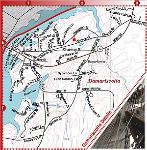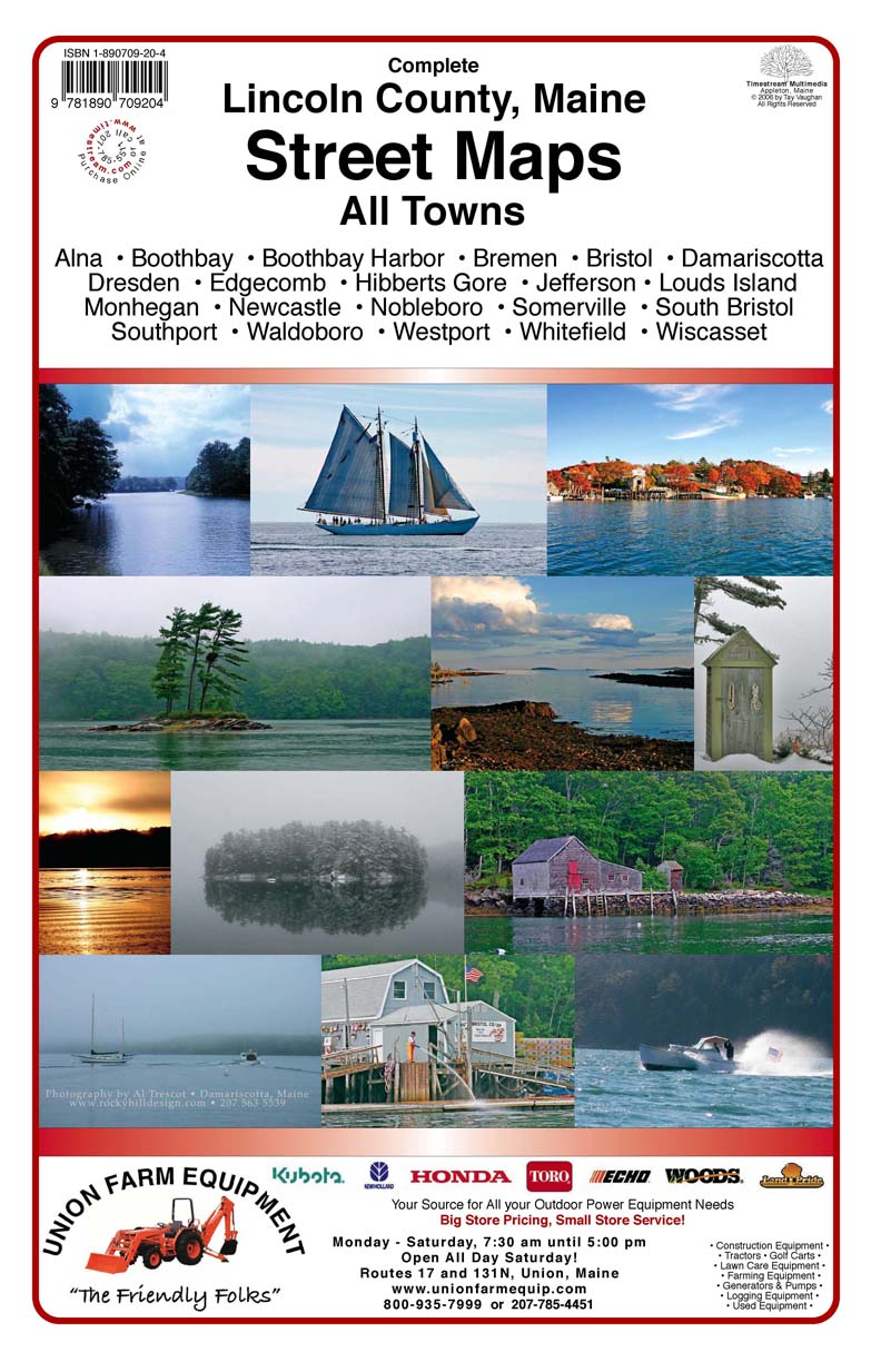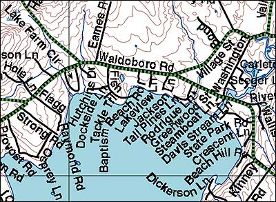 Road and street names are printed in large bold type so the maps can be as small and handy as possible but still be easily read. Where streets are tight together, as in Rockland, Camden, and Thomaston, detailed enlargements are included. Contour lines and water features such as rivers and marshes are taken from USGS data. We included cemeteries, power transmission lines, and railroads. Each town's map also includes a key for looking up its roads. We felt this was particularly important because many roads in Lincoln County have only recenty been named, and even people "born and raised" in a town may not know where a "new" street is.