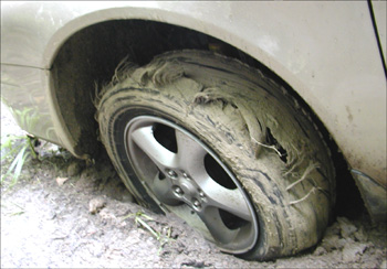 Young's front tire was torn to shreds as he tried to free his car from the mud and rocks.