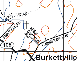 Miller Cemetery is located northwestward of Burkettville. The access road, called Miller Cemetary Road, turns east off Collins Town Road about 1/4 mile north of Route 105.