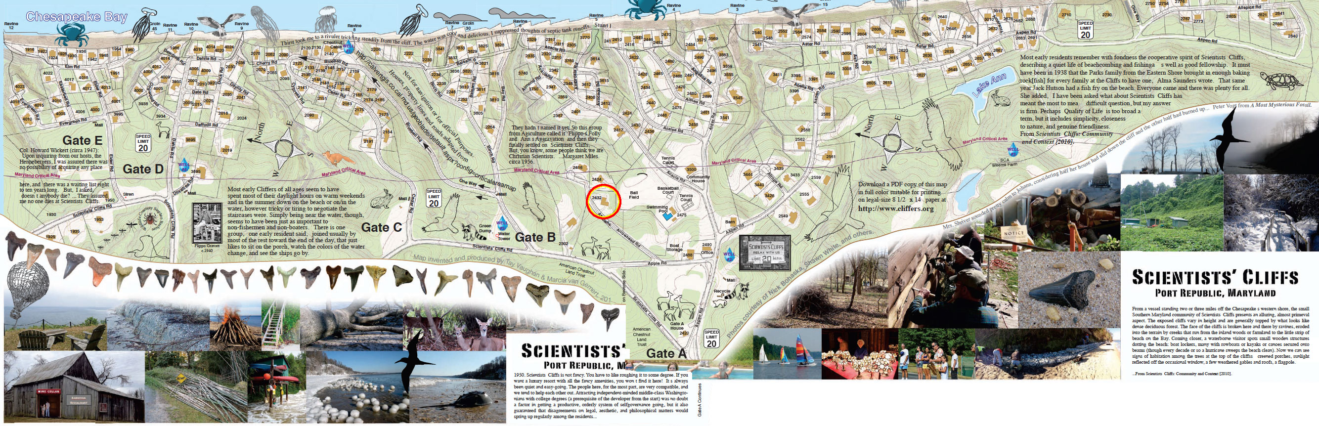 MILEMARKERS provides directions from the District of Columbia to Scientists' Cliffs, Maryland. Scientists' Cliffs is a residential community that was established in the 1930s as a summer and weekend place-of-remove from Washington. It initially consisted of a cluster of log cabins which folks rented by the week. Since the 1930s, it has evolved to, first, accommodate the construction of cabins on private lots, and eventually to include year-round residents dwelling in pretty much anywhere-style structures, but still featuring wood.