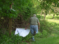 We established two 100 meter tracks using distance measuring tools in Google Earth (see Figure #1), and we dragged along the rough leaf and mulch area just outside of the mowed area of the field (See Fig. #5). At the end of each track, the drag was lifted and carried to a counting table where it was laid out, bottom-side up. Every square centimeter was carefully examined in bright sunlight with magnifying glasses See Figure #6). Ticks were captured with tweezers as shown in Figure #7 and inserted into a specimen bottle through a cover made of latex gloves bound by rubber bands around the top (See Figure #8).