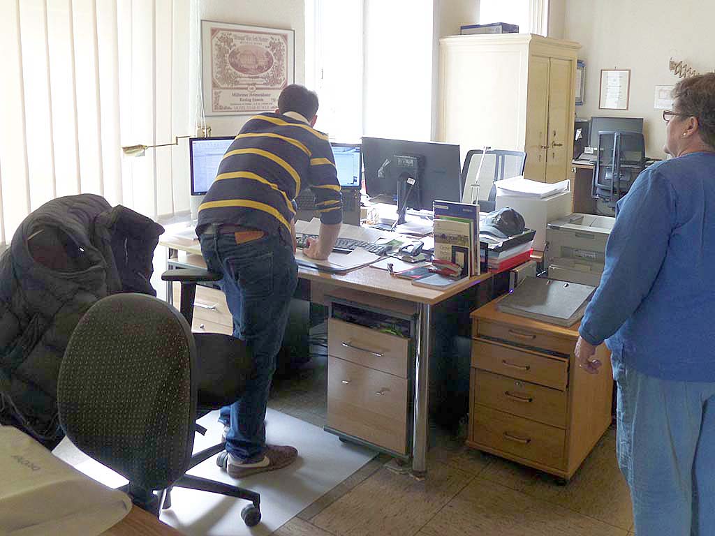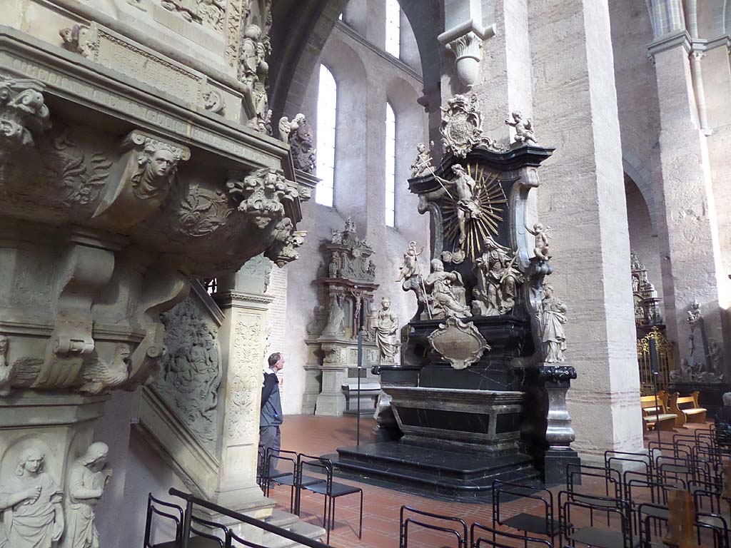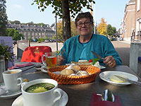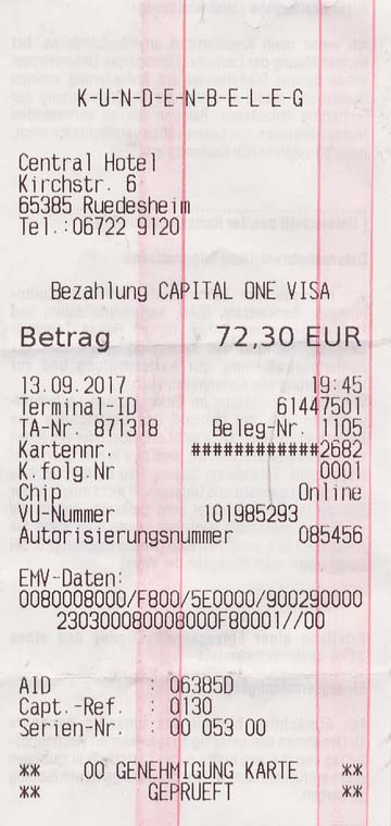 Went to the car, booted up my laptop and found one of my cards with the correct PIN and was able withdraw cash in Euros and finally pay for lunch at Cafe Venezia. While I had wandered through town in the rain for about an hour, looking for a bank autoteller, Marcia ordered more coffee and cake and offered to wash dishes; she had unexpectedly arrived in food heaven). We invited the friendly and patient (about the money) cafe owner, Michaela Dal Mas, to visit us in Washington. Barely awake, we drove on to Rüdesheim.