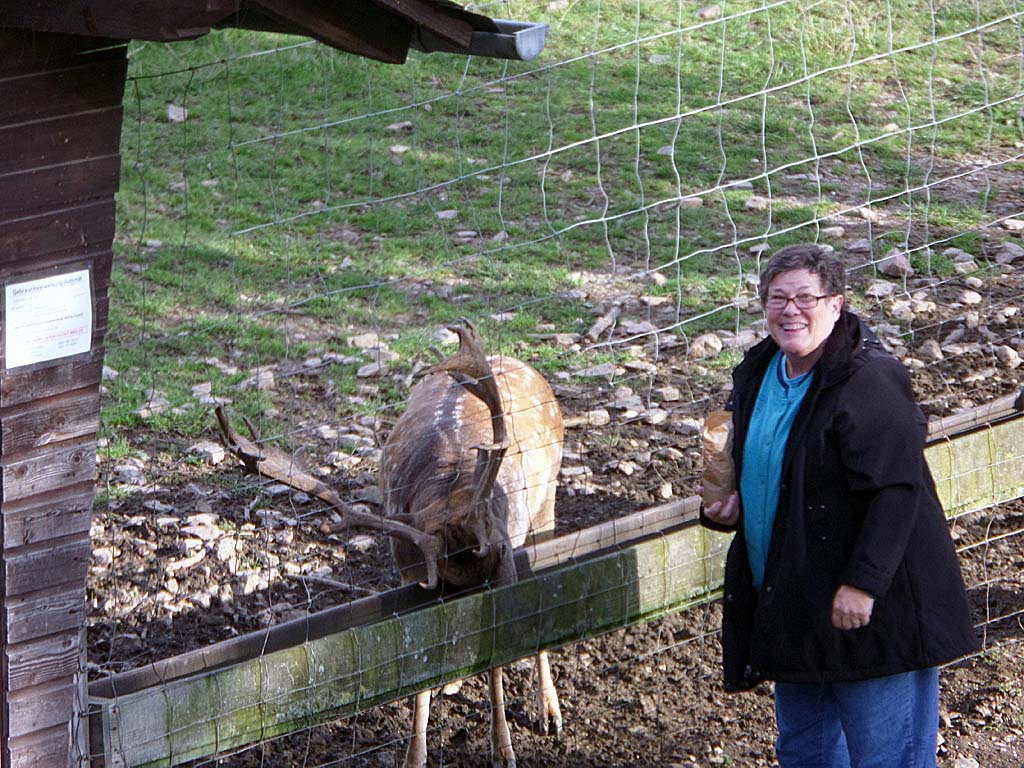 Where the Mosel empties into the Rhine. The Deutsches Eck - a major tourist destination and large city with a huge statue of Ludwig the Great on horseback. Toilet use costs a redeemable 30¢. We actually stayed outside of the city at Forsthaus-Remstecken, a small hotel located in the middle of a state forest to the west. Marcia fed corn to animals and smiled a lot.