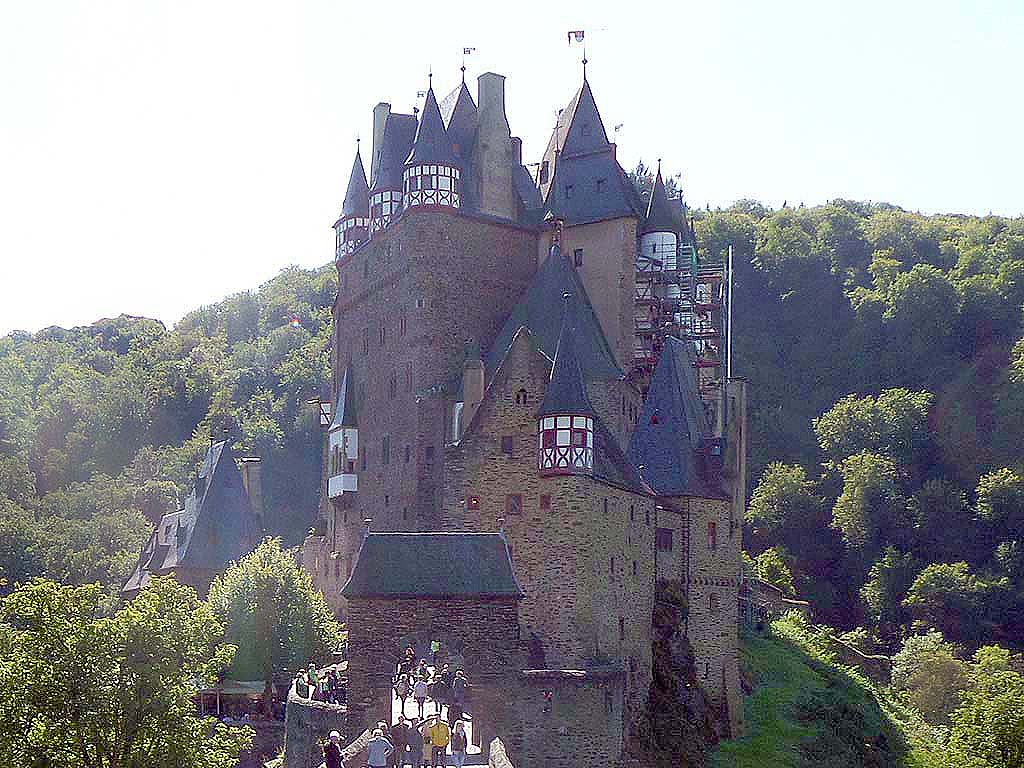 The river meandering past castles on hills; Marcia leaning on the balcony rail. The castle tour of Burg Eltz was a pre-planned requirement; we routed up and over the hills for an excursion into lovely farming country before returning down the steep bending cliff-face roads to the gorge of the Mosel.