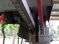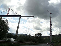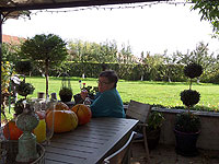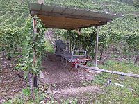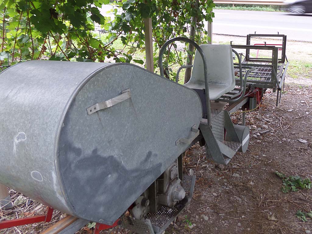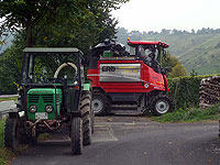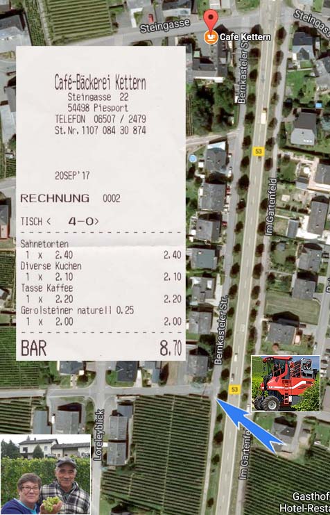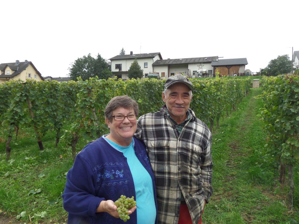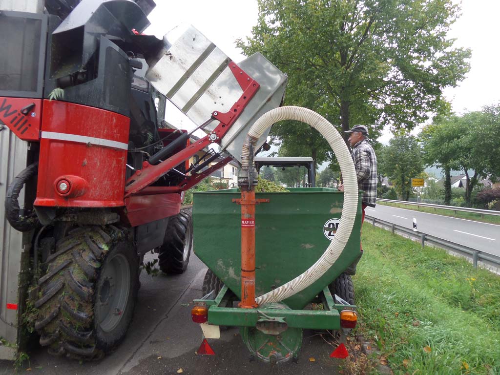 Along the way from Bernkastel to Trier, in Piesport, we befriended a wine grower (Herr Kettern) who was having most of his vinyard harvested by machine. He graciously took time from the busy harvest to answer Marcia's questions in English. Said it was cheaper than hiring Polish or Romanian pickers at the current minimum wage of €8.50 per hour - about a third as much. He couldn't do all of his rows of vines by machine, he pointed out, because his house and some trees were in the way and the machine couldn't turn around -- he would pick those rows himself by hand. He picked a single bunch of grapes for Marcia to examine for Botrytis fungus, common in this year's harvest due to wet and cloudy weather throughout the Mosel region. When finished, she was cautioned not to throw her handful of grapes into the ditch, but to toss the grapes into the green wagon with the rest of the harvest! A screw drive unloads the wagon through a five-inch hose.