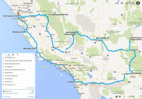 San Francisco, Muir Woods, Yosemite, Death Valley, Las Vegas, Grand Canyon, Morro Rock, Monterrey